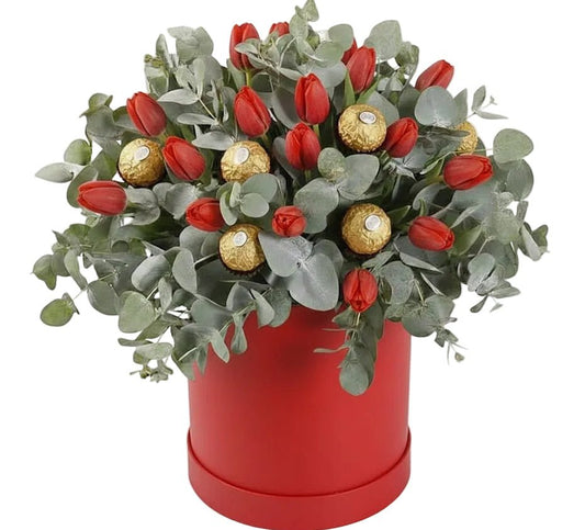 Tulips with Eucalyptus with Chocolate Box